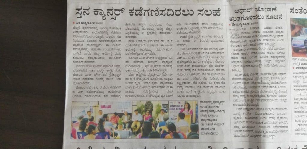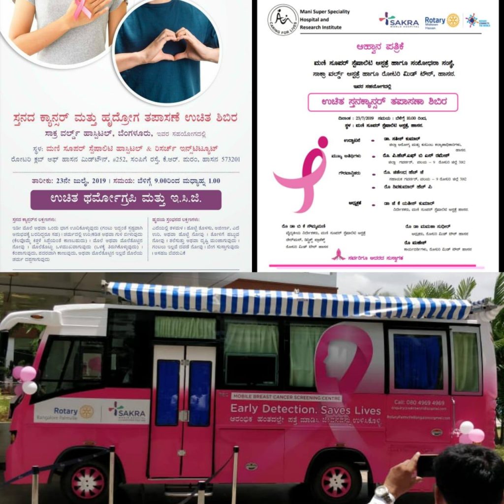 BREAST CANCER awareness & screening program was organized at Mani Super Speciality Hospital and research institute in association with Sakra world Hospital and RC of Hassan midtown on 23rd July 2019.